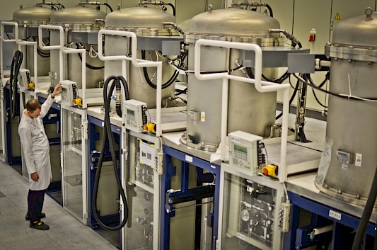 The temperature field is moved by a proper control of the heater system ensuring the given growth rate and interface shape. The low axial temperature gradient of typically below 5K/cm leads to crystals characterized by very low dislocation density.