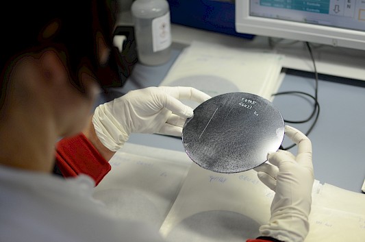 Crystal growth is initiated mostly by a <100>-oriented seed fixed in the lower part of the crucible and continued with an upward moving solid/liquid interface.